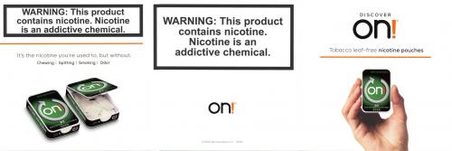 Direct mail received in October 2019 that promotes ON!, a new tobacco-free nicotine pounch. Describes all the flavors and nicotine strengths that will be available, and includes coupons. Mentions that the product will be available at Circle K stores.