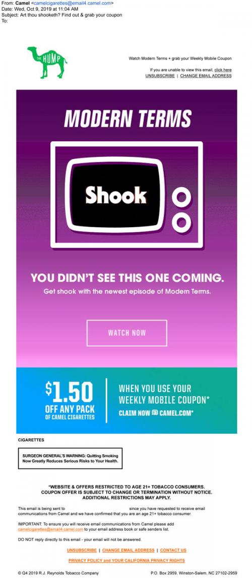 Email from Camel in October 2019 promoting a new episode of Modern Terms, with a link to claim a mobile coupon.