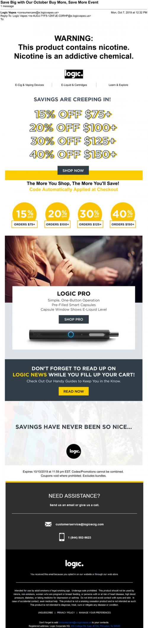 Email from Logic in October 2019 promoting a sale on products through their online store. Also has a link to read brand news on the website.