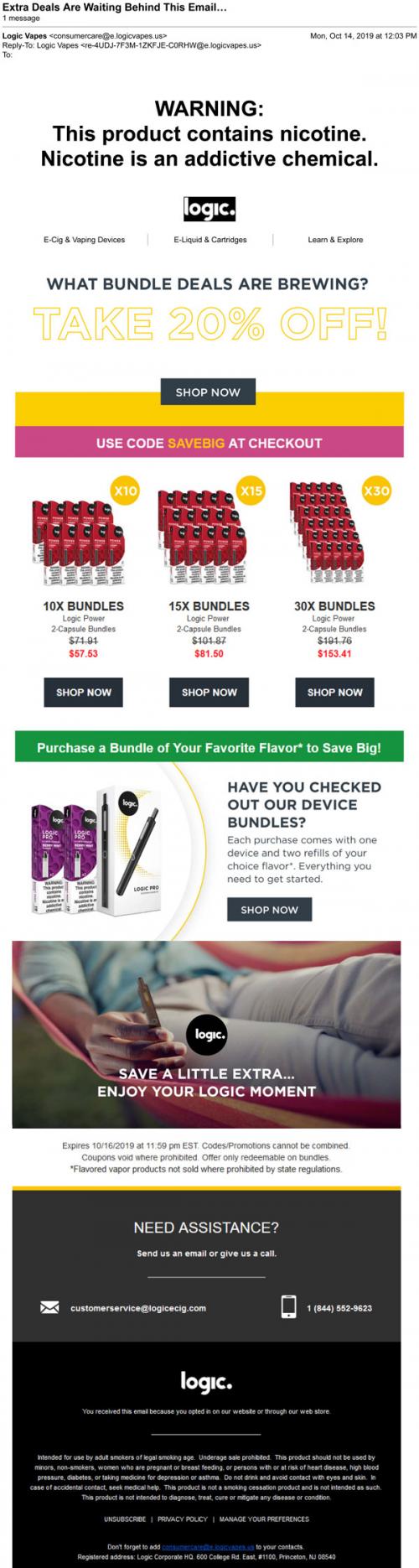 Email from Logic in October 2019 promoting bundle sales through the brand website, with highlights on flavors.