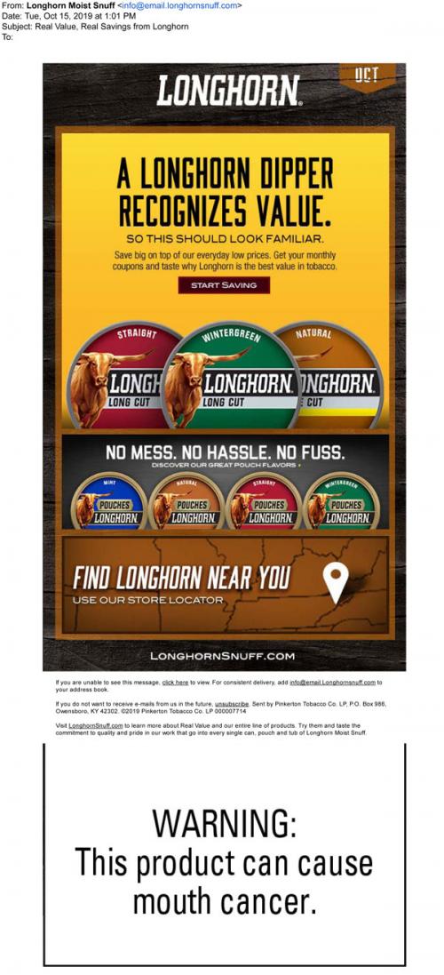 Email from Longhorn in October 2019 promoting monthly coupons and their pouch products. Also links to a store locator to use on the brand website.
