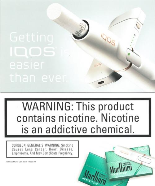 Direct mail received in October 2019 that promotes the IQOS device and where to purchase one in Georgia. Includes an image of different menthol HeatSticks packs.