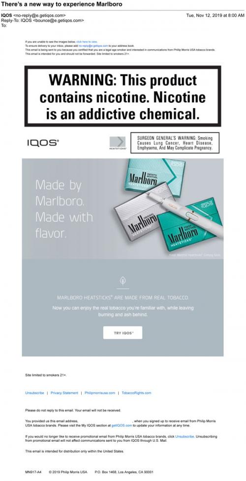 Email in November 2019 promoting Marlboro HeatSticks for IQOS devices. Includes images of fresh and smooth menthol and original packs. Links to the brand website to learn more.