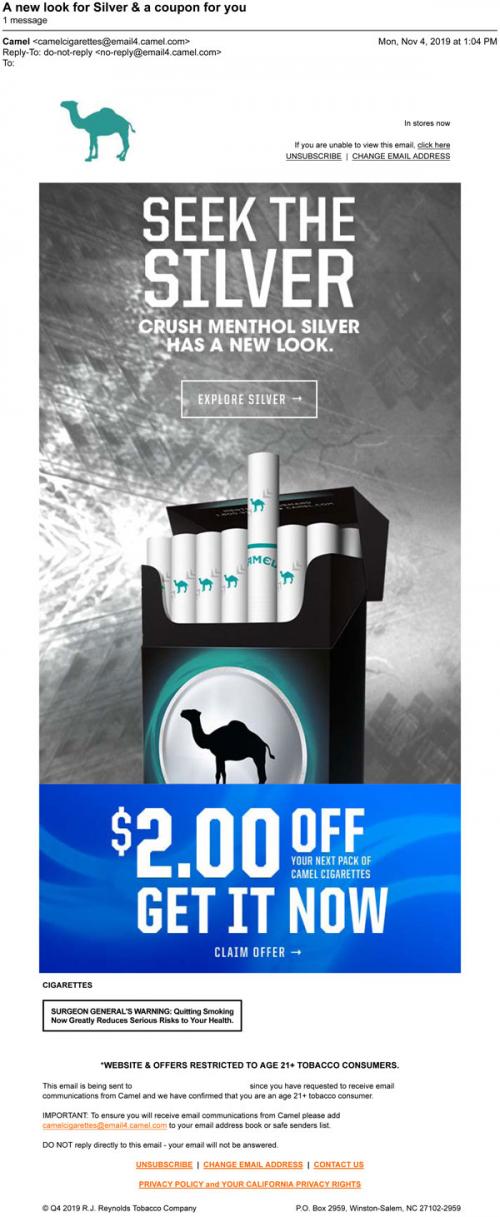Email from Camel in November 2019 promoting a new pack design for Camel Crush menthol silver. Also includes link to claim a coupon offer.