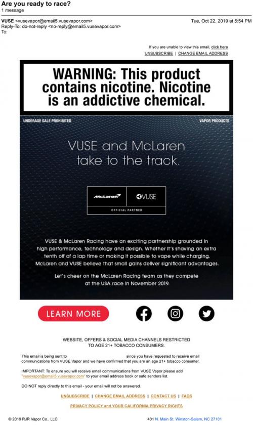 Email from Vuse in October 2019 promoting the brand's partnership with McLaren Racing.