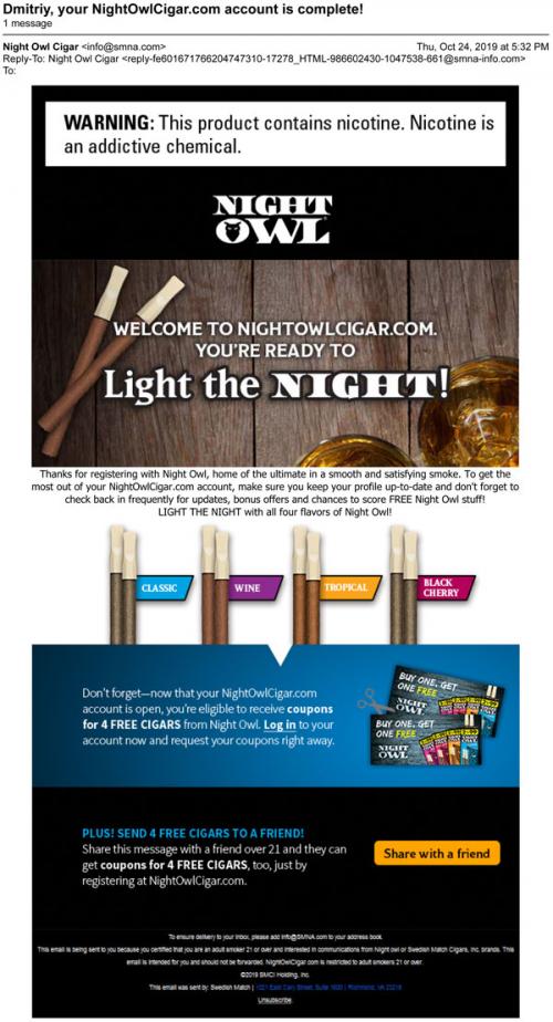 Email from Night Owl in October 2019 welcoming the recipient after they signed up on the brand website. Includes reminders to request coupons or send the offer to a friend. Has images of their flavor lineup.