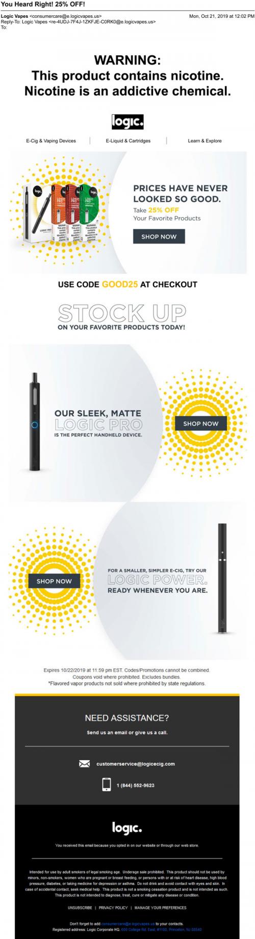 Email in October 2019 from Logic that promotes a sale on products through their online store.