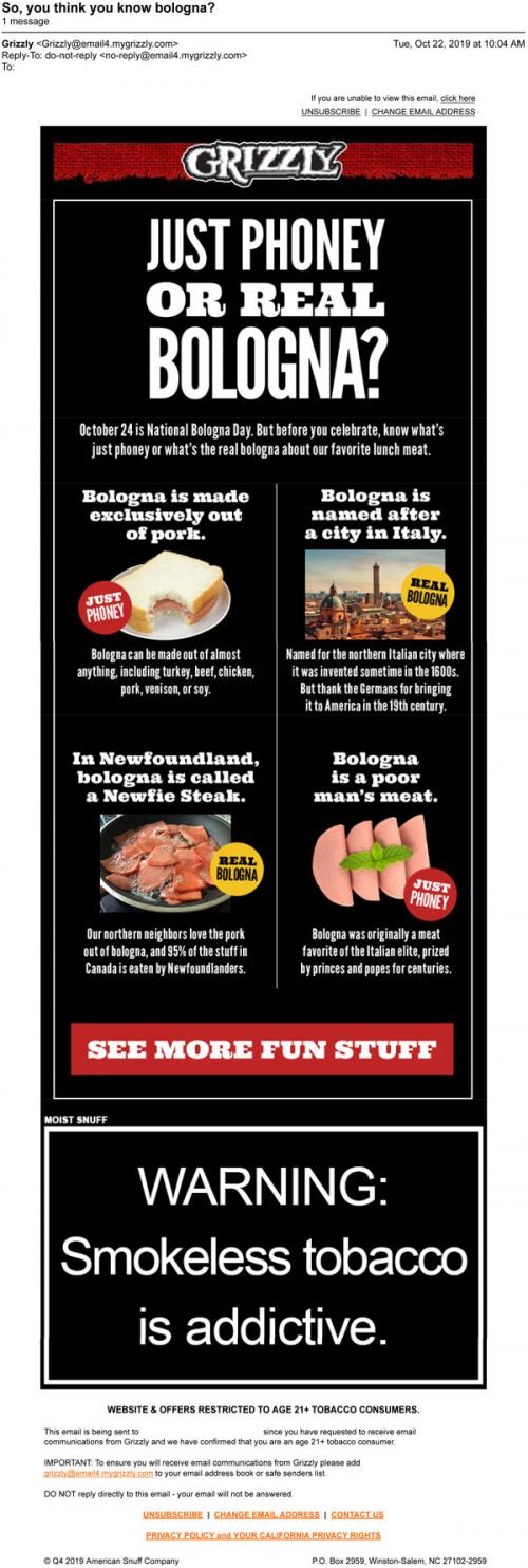Grizzly email in October 2019 with some facts about bologna and a link to check out "more fun stuff" on the brand website.
