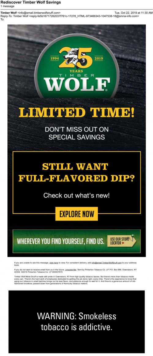 Timber Wolf email in October 2019 that promotes coupon offers for the brand's 25th anniversary, and provides links to check out their dips and find a store on the brand website.