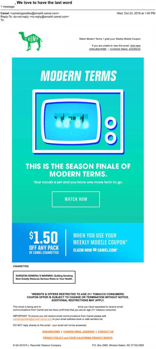 Email from Camel in October 2019 that promotes a new episode of modern terms with a link to claim a weekly mobile coupon.