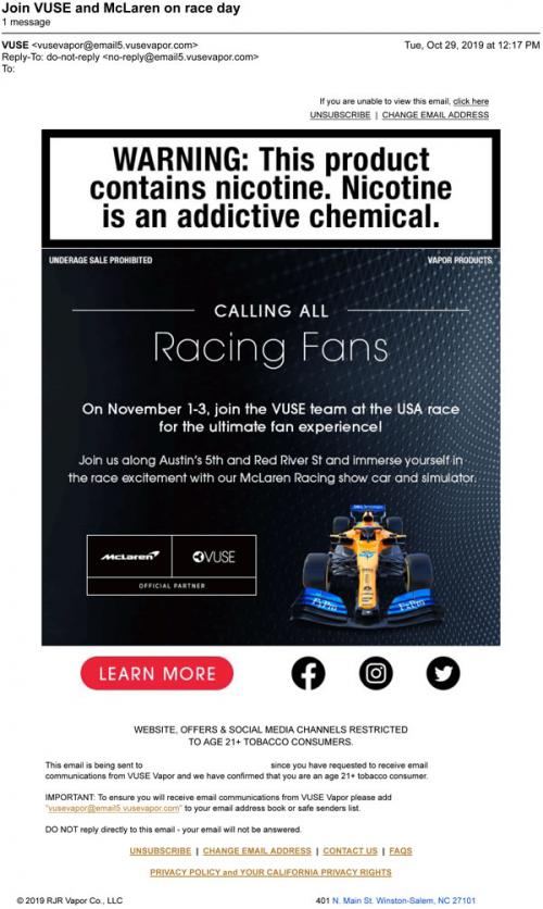 Email from Vuse in October 2019 promoting the upcoming McLaren Racing show where fans can see the brand's car and experience the race.