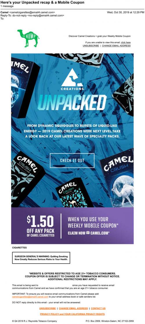 Email from Camel in October 2019 with a link to view the Camel Creations pack designs on the brand website and to claim a weekly mobile coupon.