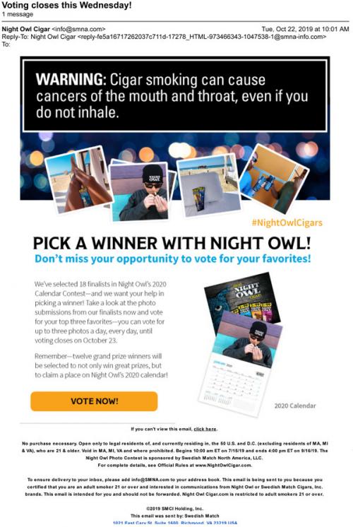 Email from Night Owl in October 2019 asking the recipient to vote on the brand website for the winner of the Calendar Contest.