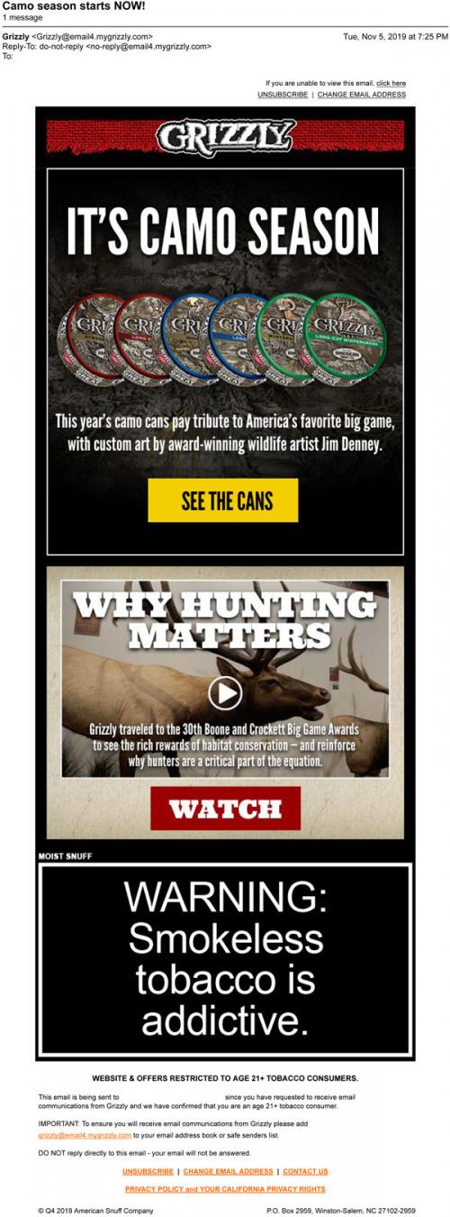 Email from Grizzly in November 2019 promoting their seasonal camo can designs and a video about why hunting matters on the brand website.