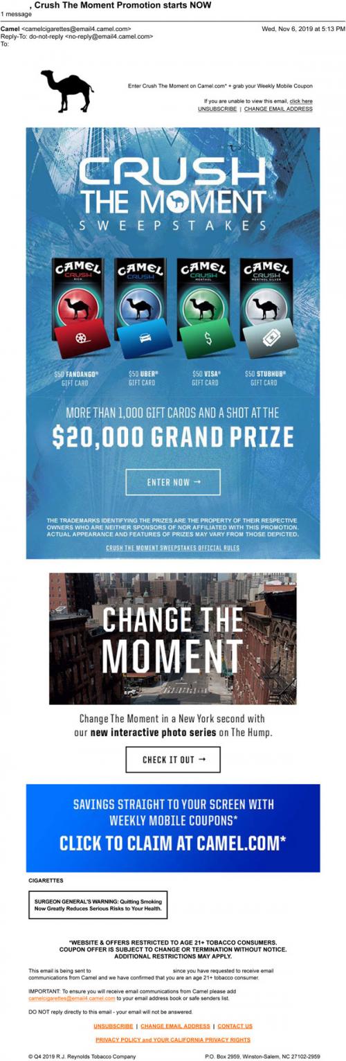 Email from Camel in November 2019 promoting the Crush the Moment sweepstakes, with a link to the brand website to enter. Also provides links to claim mobile coupons and see interactive photo displays in the Change the Moment feature.