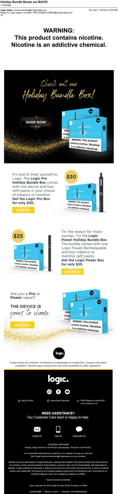 Email from Logic in November 2019 promoting their Holiday Bundle Box, with links to the brand website to purchase.