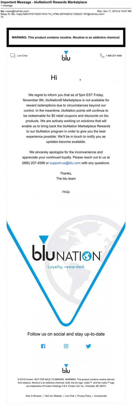Email from Blu in November 2019 informing the recipient that the Blu Nation Marketplace will no longer offer reward redemptions for points. Points will be exchangeable for coupons and discounts on Blu products only.