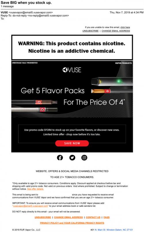 Email from Vuse in November 2019 containing a promo code to get a discount on flavor packs. Includes a link to the brand website to purchase.