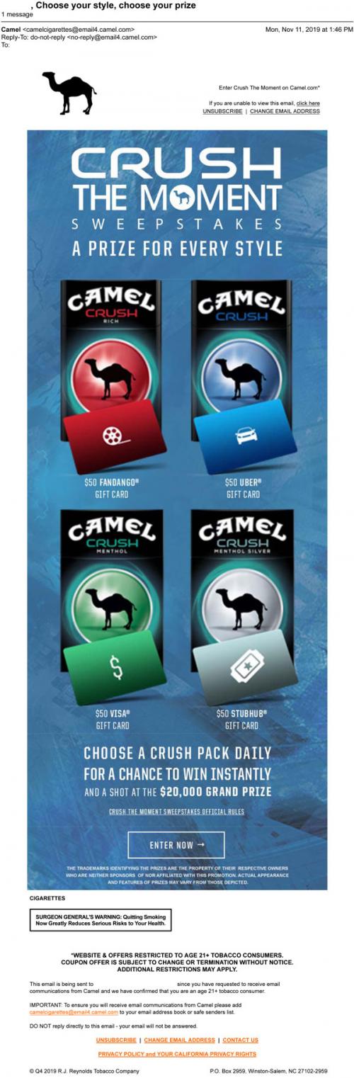 Camel email in November 2019 promoting the Crush the Moment sweepstakes, showing various possible prizes to win. Provides a link to the brand website and includes a reminder to play daily.
