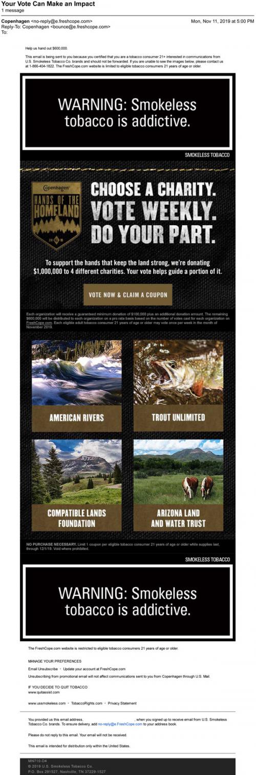 Email from Copenhagen in November 2019 with an invitation to vote for a charity the brand will support in their Hands for the Homeland project. Provides a link to the brand website to vote and claim a coupon.