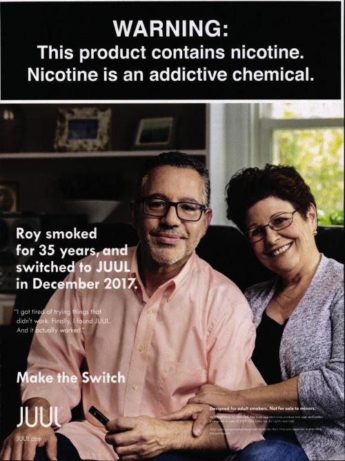 Magazine ad for JUUL featuring a couple and customer testimonial about switching to the product.