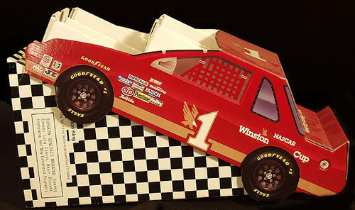 The display is red, car shaped, stating "Winston Cup Series displayed, winston packs, card board.