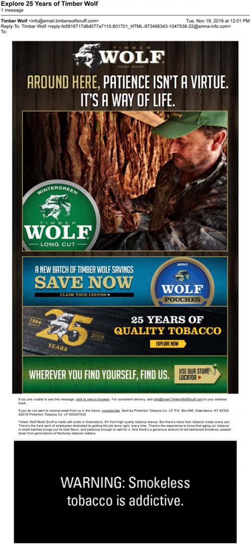 Email from Timber Wolf in November 2019 promoting coupons to claim on the brand website, the history of the brand, and a store locator you can use.