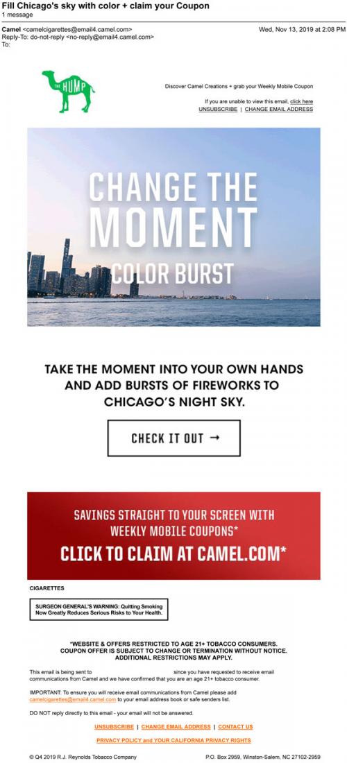 Email from Camel in November 2019 linking to an interactive photo experience on the brand website and to claim weekly mobile coupons.