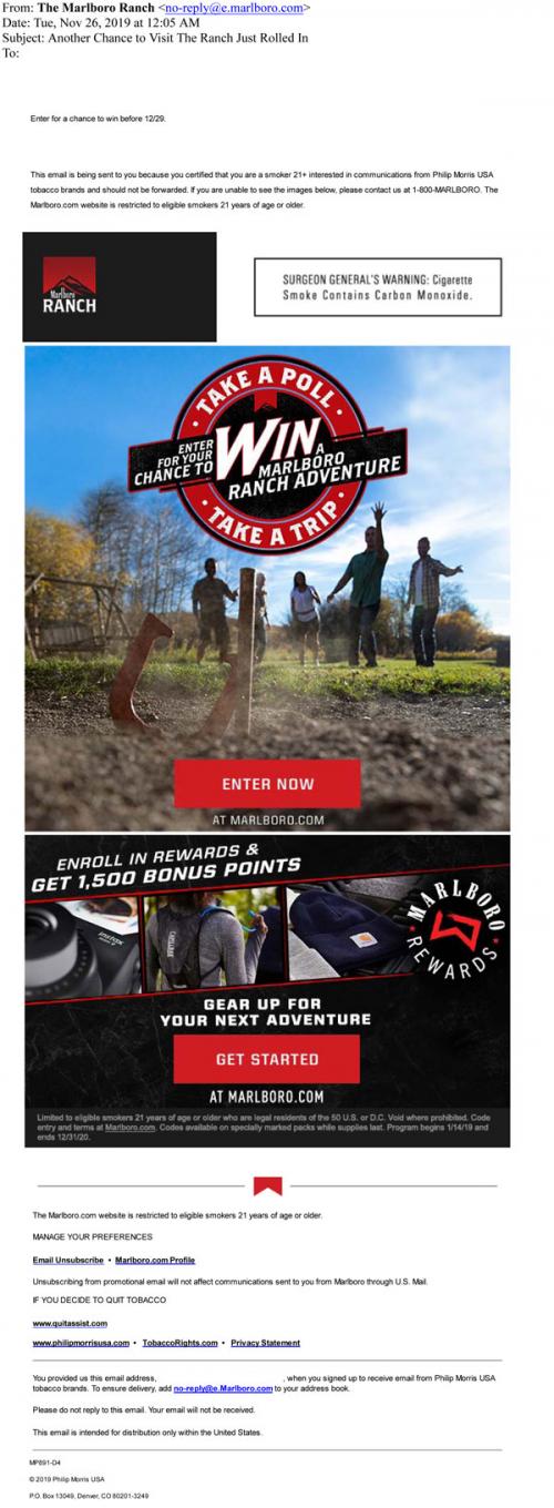 Email from Marlboro in November 2019 promoting a chance to visit the Ranch, with links to enter and enroll in the Rewards program to earn points to exchange for prizes.