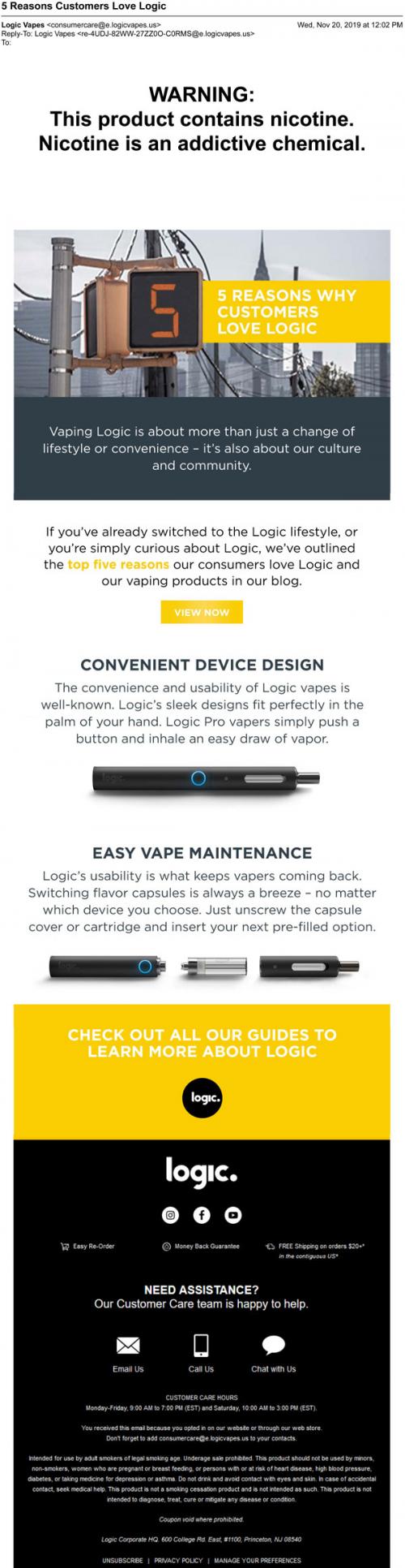 Email from Logic in November 2019 that provides links to read why customers love the brand on their blog and various device use guides.