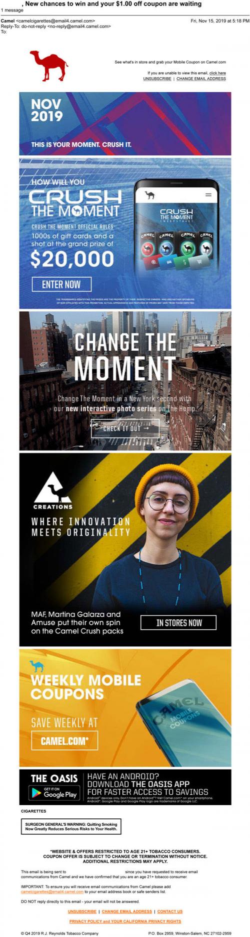 Email from Camel in November 2019 with a newsletter for the month that promotes various things going on at the brand website. Includes a promotion for the ongoing Crush the Moment sweepstakes, the interactive photo series called Change the Moment, features on artists behind the Camel Crush packs, and an invitation to claim weekly mobile coupons. Also promotes the brand's Oasis App.