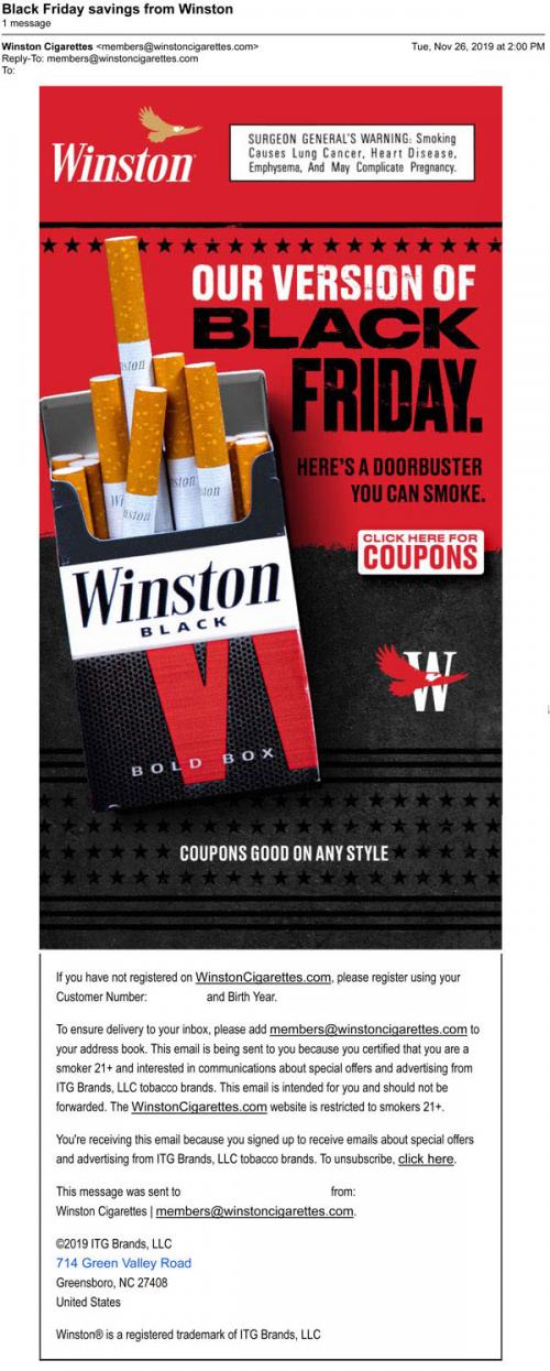 Email from Winston in November 2019 with "Black Friday" coupons to claim on the brand website, while promoting their Black (bold) product.