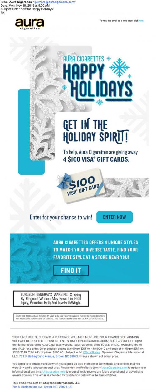 Email from Aura cigarettes in November 2019 that promotes a holiday sweepstakes with a link to enter.