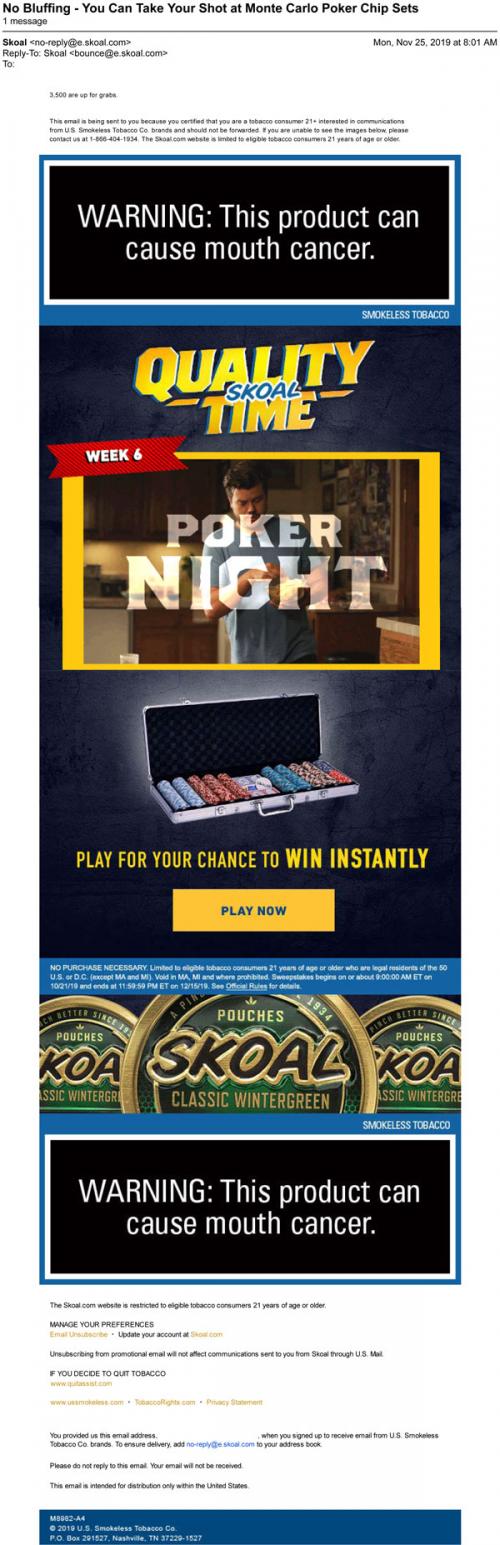 Email from Skoal in November 2019 promoting a new week of the Quality Time sweepstakes, with a new chance to win a poker set.