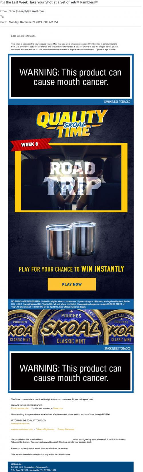 Email from Skoal in December 2019 promoting a new chance to enter the Quality Time sweepstakes, with a link to the brand website to win some road trip themed prizes.