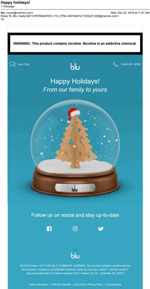 Email with wishes for happy holidays from blu in December 2019, including a reminder to follow the brand on social media.
