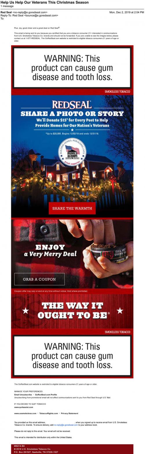 Email from Red Seal in December 2019 inviting the recipient to share a holiday photo or story with a promise that the brand will donate to veterans for every post. Also provides a link to claim coupons.
