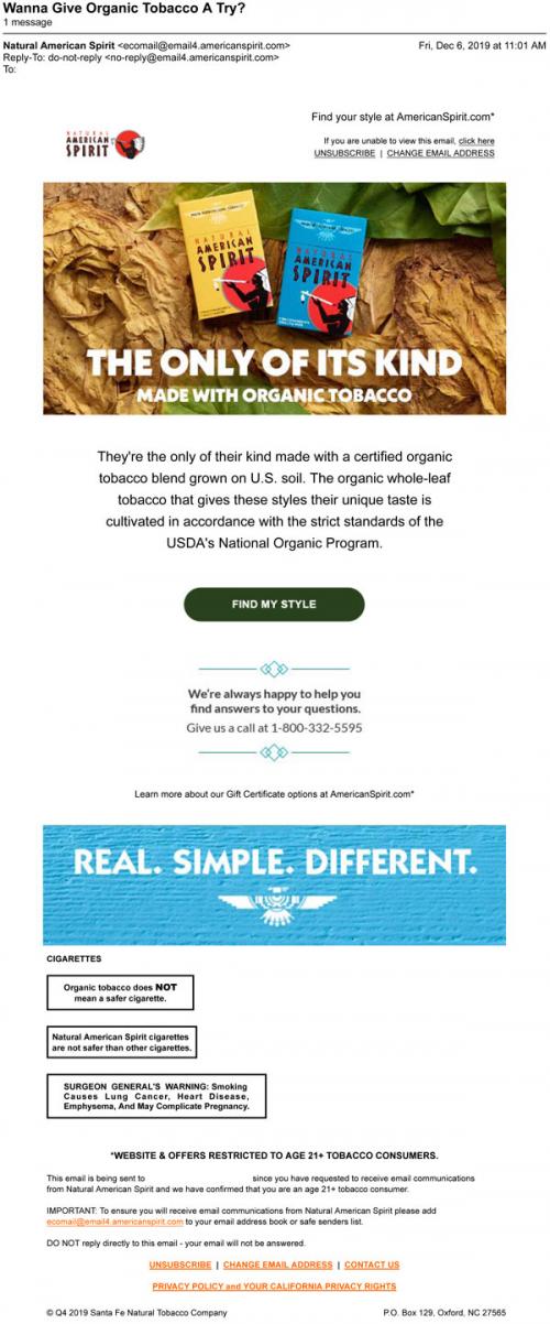 Email from American Spirit in December 2019 promoting their organic tobacco products. Provides links to the brand website to learn more about their styles and claim coupons.