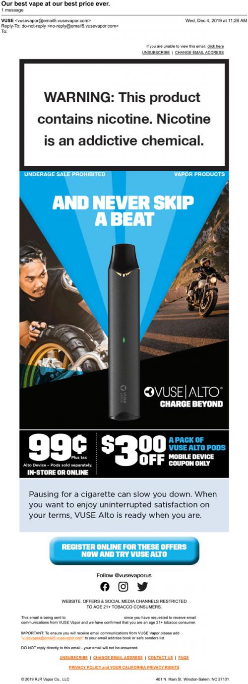Email from Vuse in December 2019 promoting their Alto device with several offers and a reminder to sign up on the brand website.