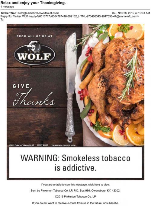Email from Timber Wolf in November 2019 with a message to the recipient to enjoy Thanksgiving.