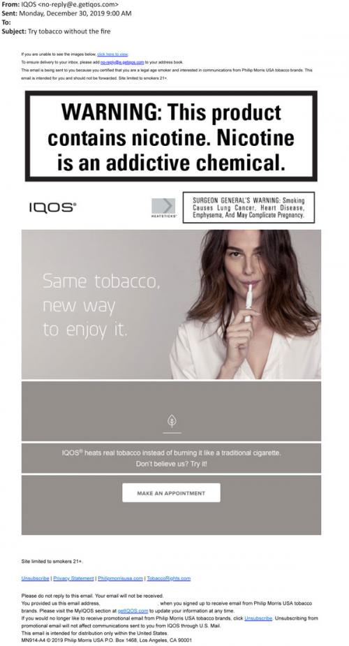 Email promoting IQOS in December 2019 as the "same tobacco, new way to enjoy it." Includes a link to make an appointment at an IQOS store to try the product.