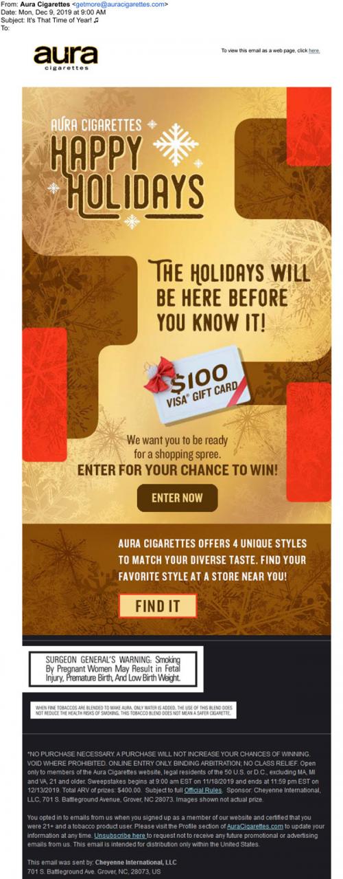 Email from Aura in December 2019 promoting a chance to win a gift card for the holidays, and a link to the brand website to explore styles and find a nearby retail store.