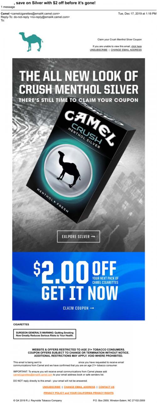 Email from Camel in December 2019 promoting the Crush menthol Silver product, with a coupon to claim from the brand website.