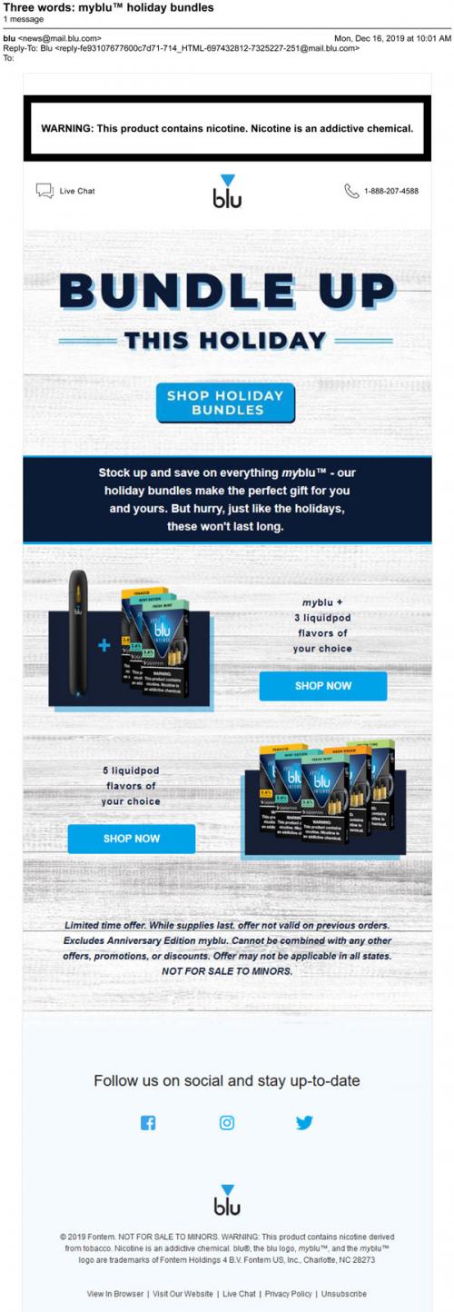 Email from blu in December 2019 promoting a holiday bundle sale through the brand website. Reminds the recipient to follow the brand on social media.