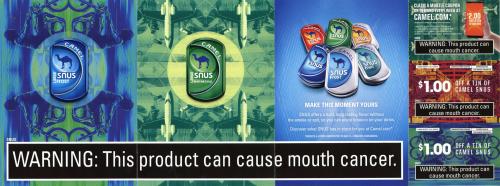 Camel Snus direct mail received in January 2020 that shows the product line and contains coupons. Reminds the recipient to claim weekly mobile coupons as well. Text: "No spit. No smoke. Just flavor."