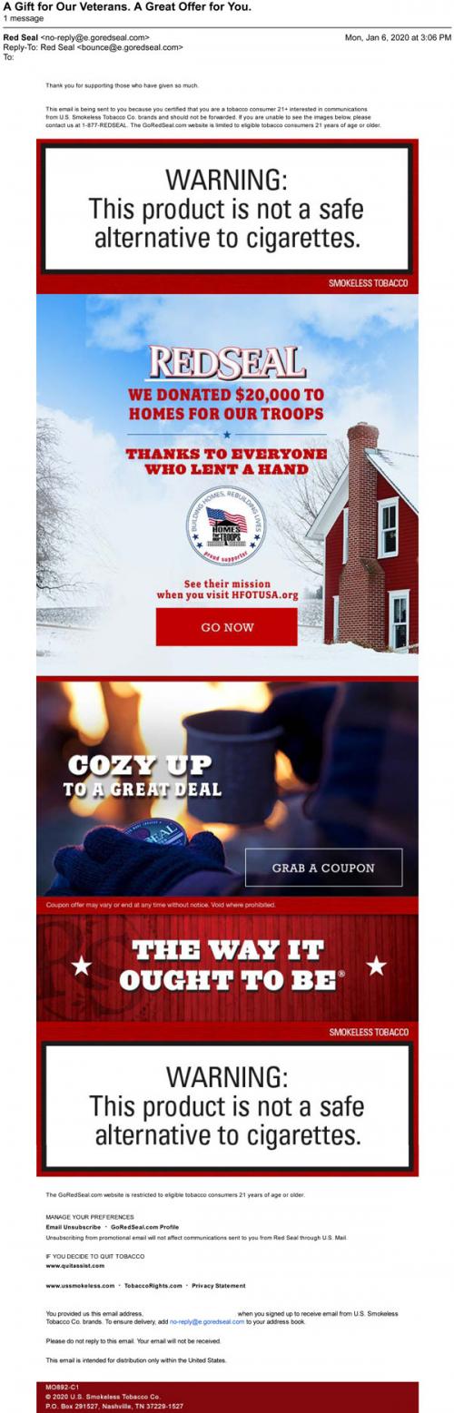 Red Seal email from January 2020 thanking everyone who helped the brand donate money to homes for veterans. Also includes a reminder to claim a coupon from the brand website.