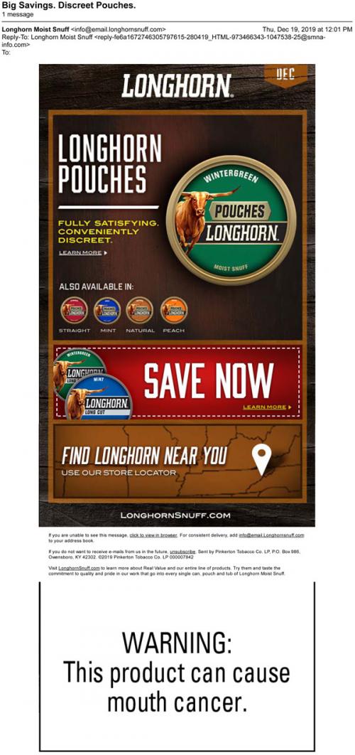 Email from Longhorn in December 2019 promoting their pouch products, with links to claim coupons and use a store locator on the brand website.