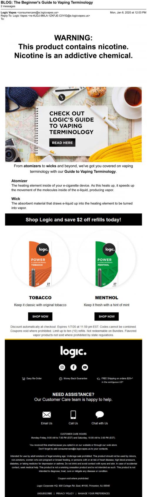 Email from Logic in January 2020 linking to a guide on vaping terminology and promoted a sale on cartridge refills through the brand website.