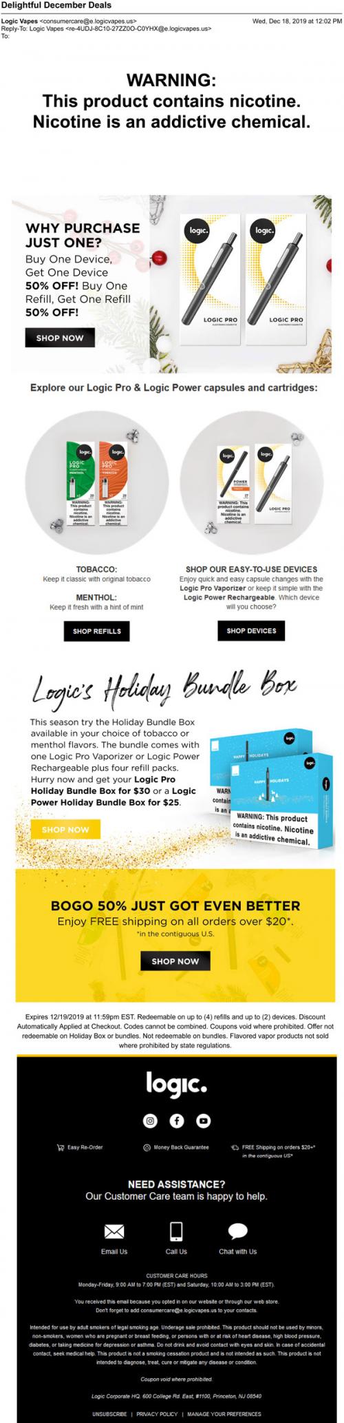 Email from Logic in December 2019 promoting sales on refills and devices, as well as a Holiday Bundle Box available to purchase on the brand website.