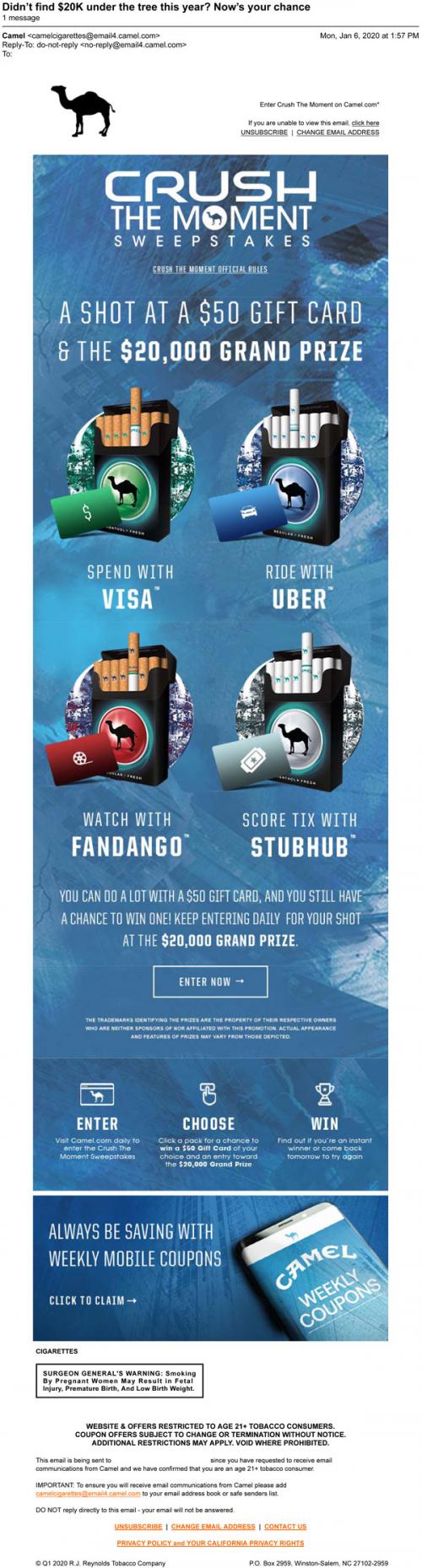 Email from Camel in January 2020 promoting the Crush the Moment sweepstakes and the availability of weekly mobile coupons.